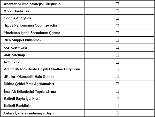 Bu yazımızda size kendi sitenizin SEO çalışmasına başlamadan önce bir kontrol listesi (checklist) vereceğiz, bu listedeki adımları tamamladıkça sizde sitenizin gelişimini görebilirsiniz. İlk olarak başlıca 3 SEO kavramından bahsedeceğiz; anahtar kelime araştırması, sayfa içi ve sayfa dışı optimizasyon.